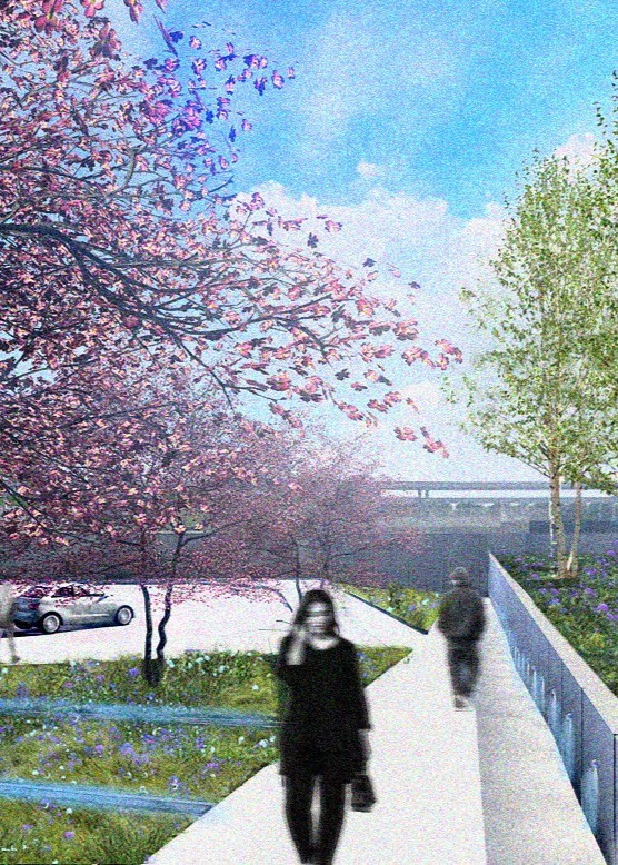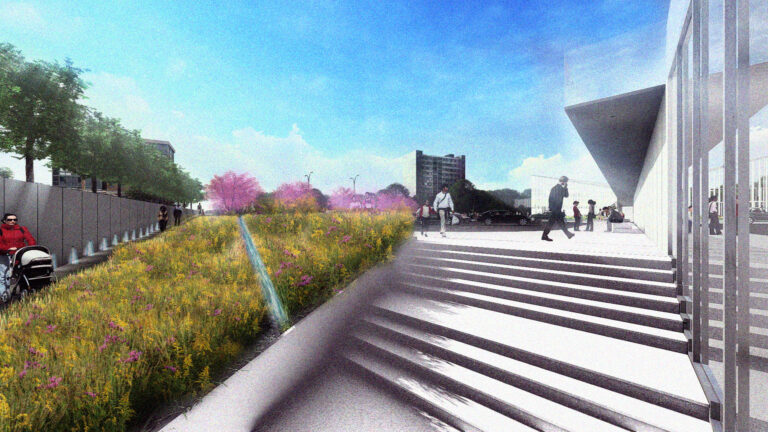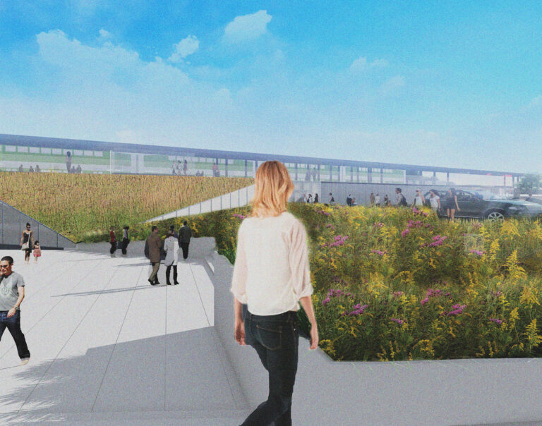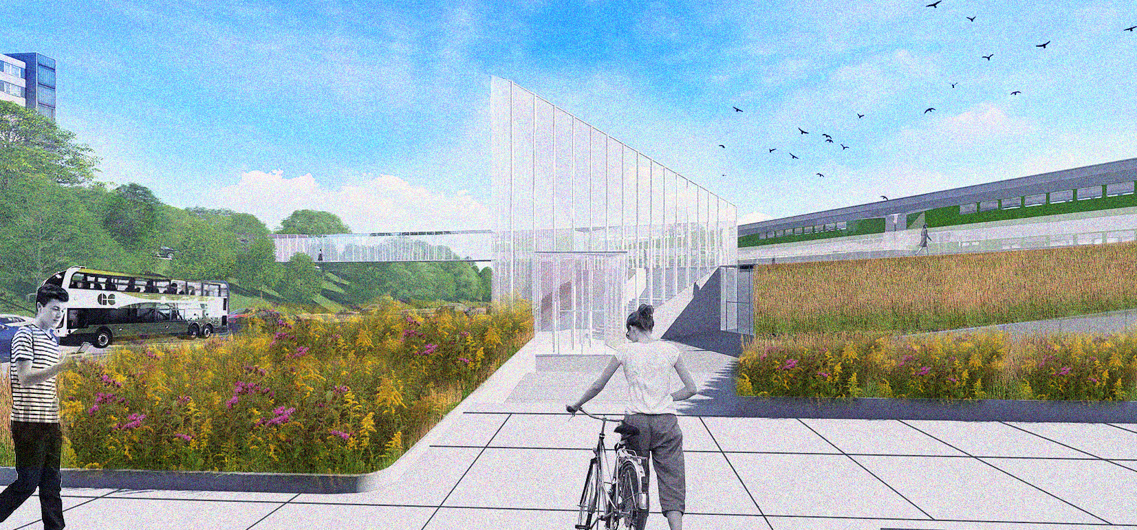 The transparent station frames seasonal views of color, merging planters and slopes into an immersive, atmospheric commute grounded in ecological succession. Ecological succession, a design intervention, can influence other design disciplines. The site’s transparent architecture, sheltering ecological succession, allow commuters to once again re-engage with nature.