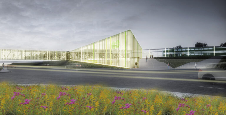 The concept is programmatically driven by urban ecology, steep topography, triangular site geometry, and climatic challenges. It lies within a windy industrial corridor and two parking lots bisected by an arterial road.