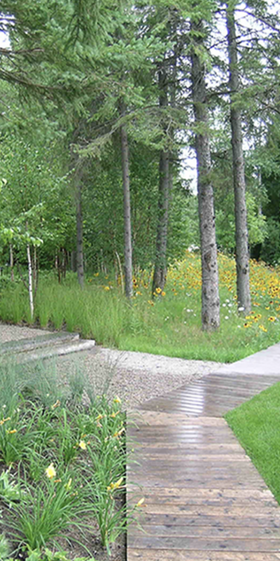 This is a typical subdivision home built in the 1970s with no distinguishing features. The one outstanding feature was its location at the edge of a ravine. The challenge was to create a garden that enhanced the architecture and connected it visually and functionally to the ravine. The garden was centered functionally around suburban life with an outdoor kitchen, BBQ and swimming pool. Existing topography was used to create stepped terraces down to the ravine. Perennial planting in a wild configuration mimic its naturalness. A trellis wrapped around the edge of the ravine with views oriented the clients to the ravine tying the more ridged geometry of the garden structure with the naturalness of the ravine.